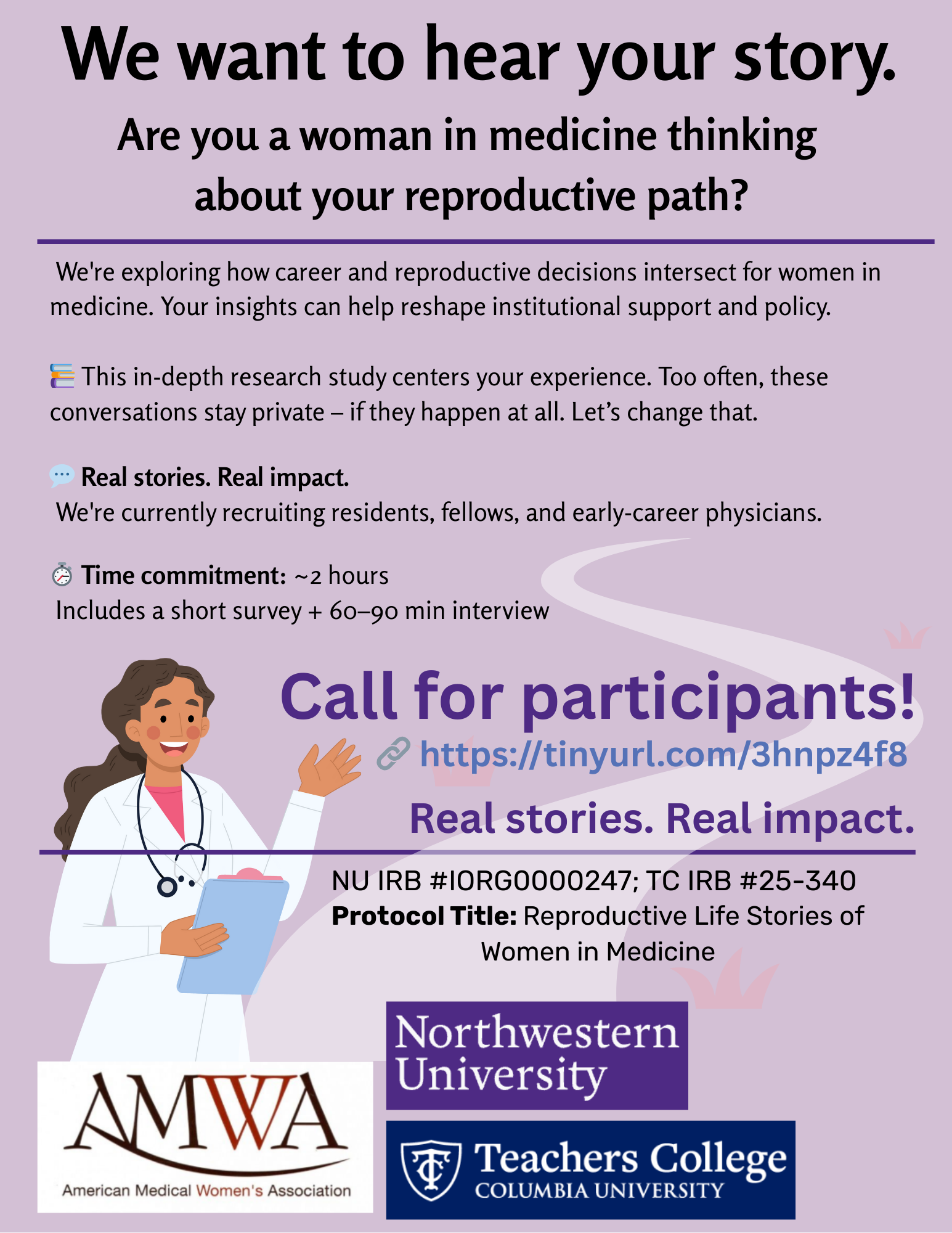 In a confidential one-on-one Zoom interview, you’ll have the opportunity to share your story. We’re asking: How can institutions better support women in medicine through reproductive transitions? Your voice can help shape policy and promote structural change.