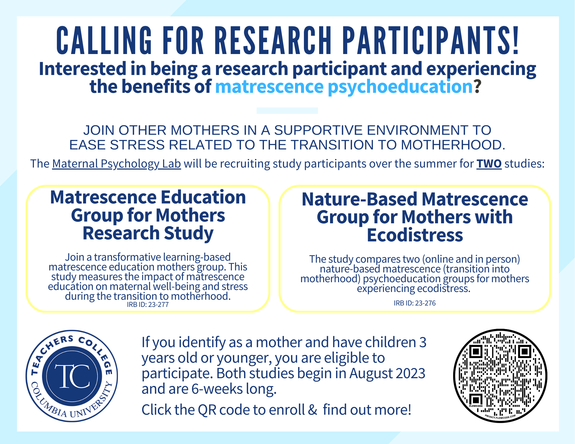 Becoming a mother is a significant life transition. This study is a chance to: